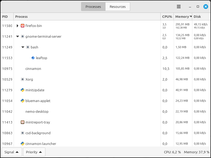 A graphical top-style Linux system monitor program with simple process tree grouping and additional system statistics.